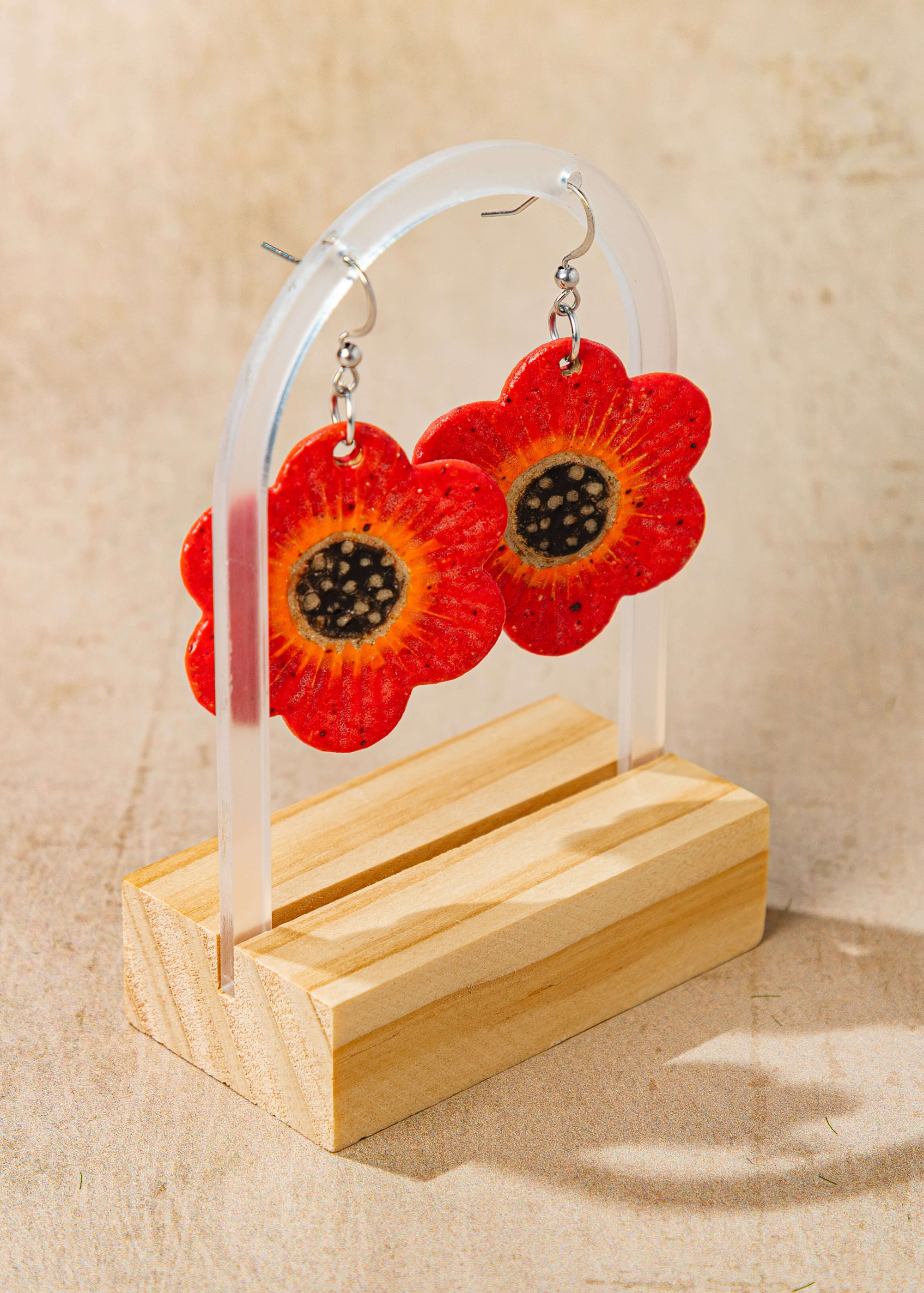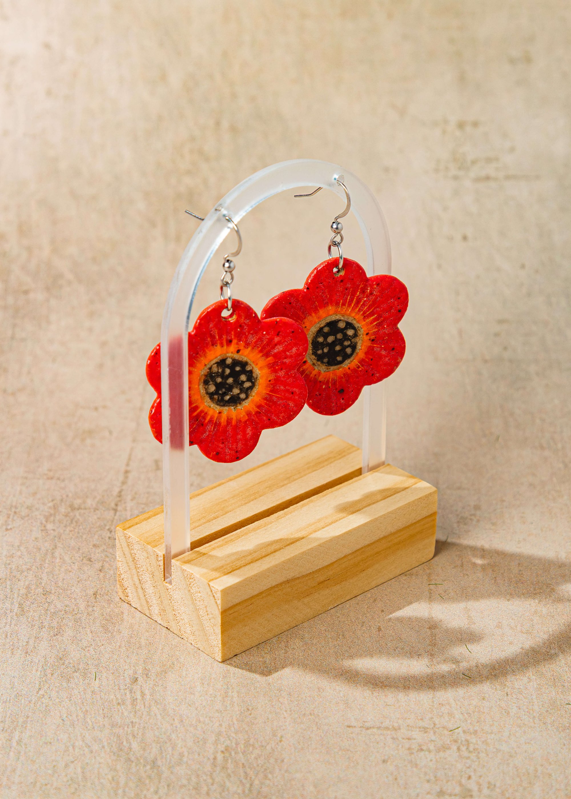 These poppy flower earrings are hand-built using a brown speckled stoneware and feature engraved details.